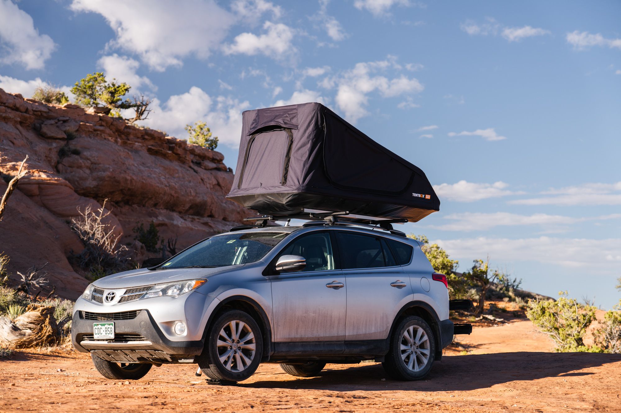 La Tentbox GO és una tenda de sostre lleugera i minimalista, dissenyada per TentBox per ser assequible i versàtil. Ofereix una estada còmoda per a dues persones amb un llit de tela tensada. El muntatge inicial dura aproximadament 60 minuts.