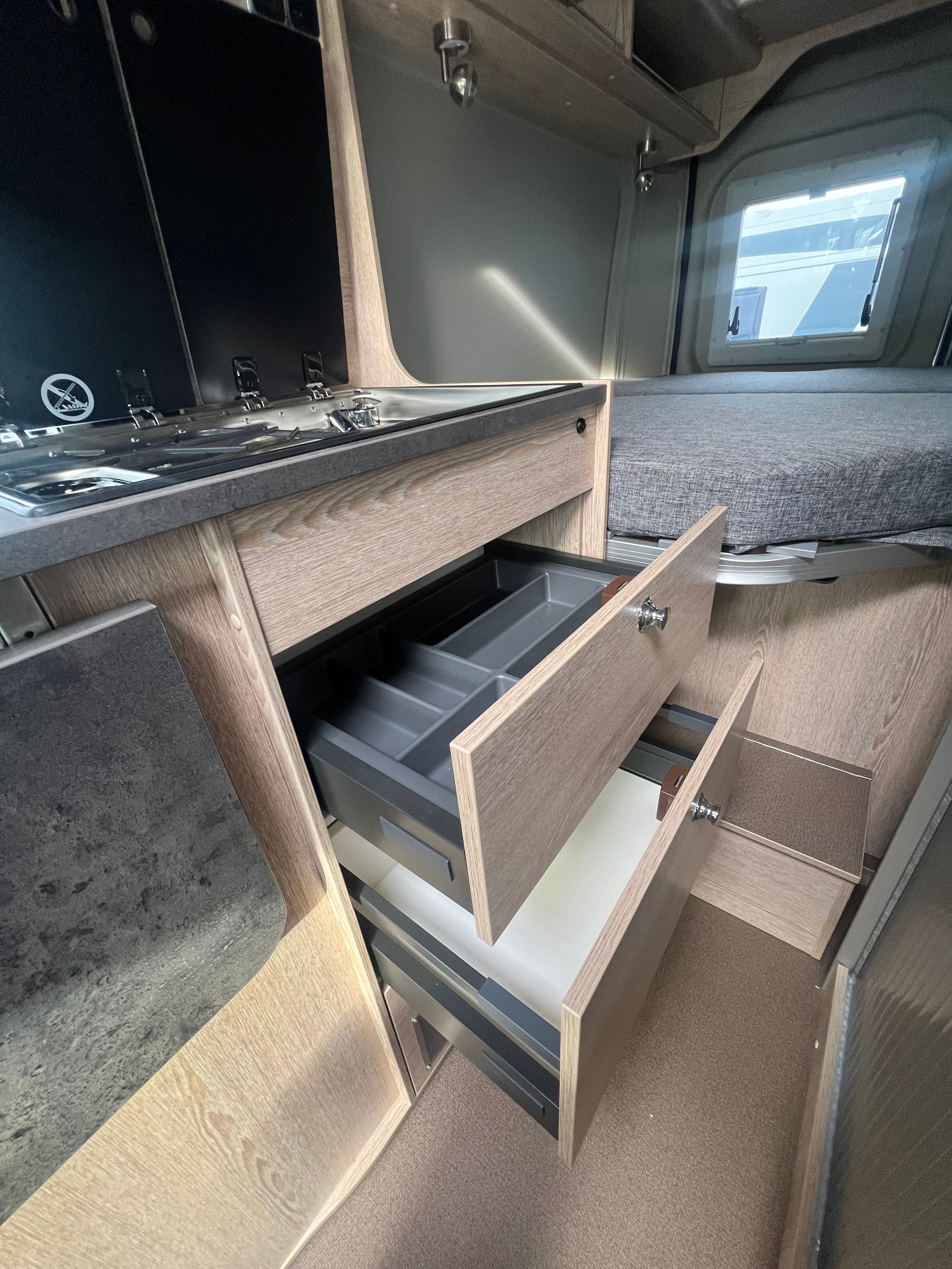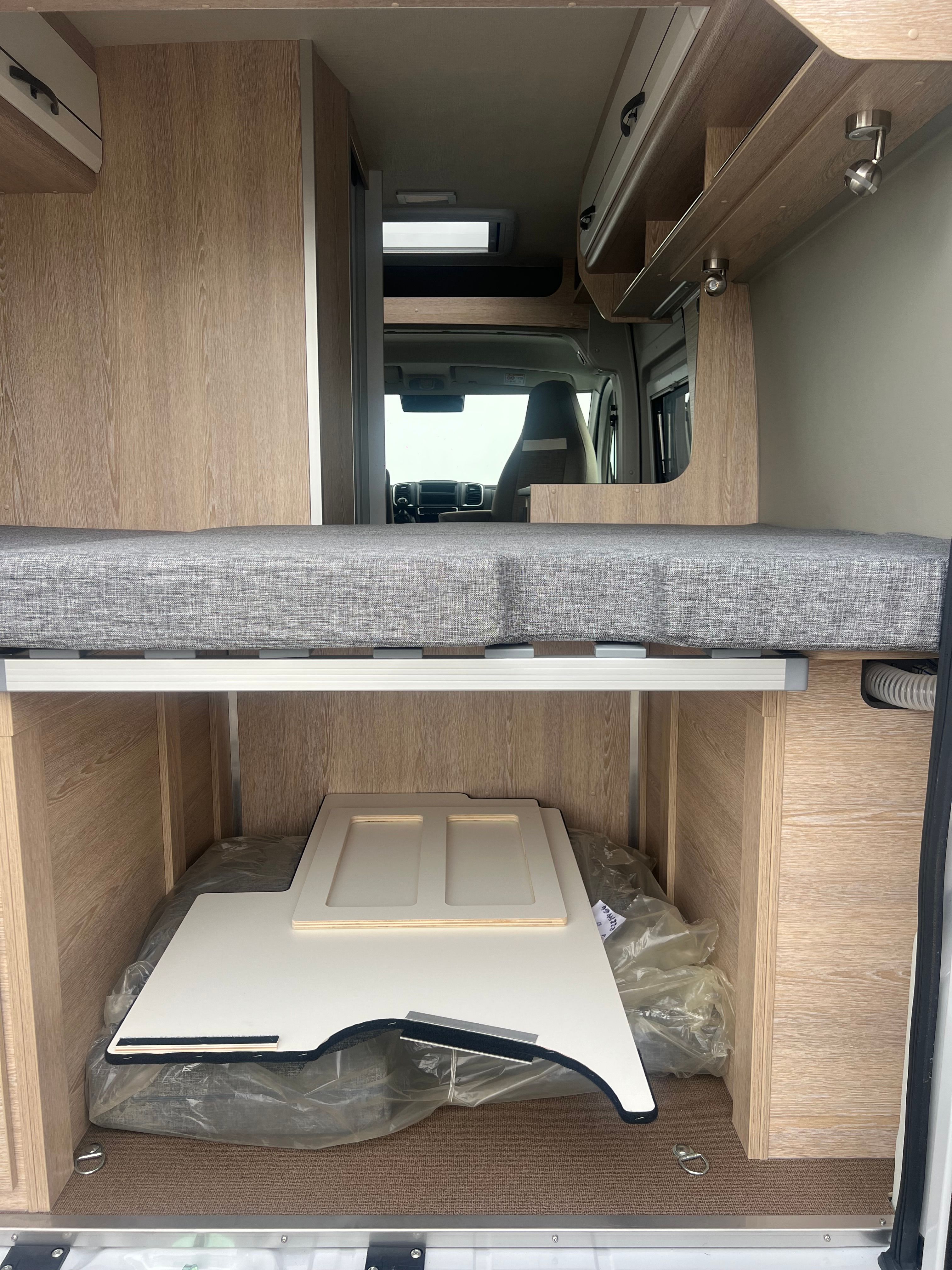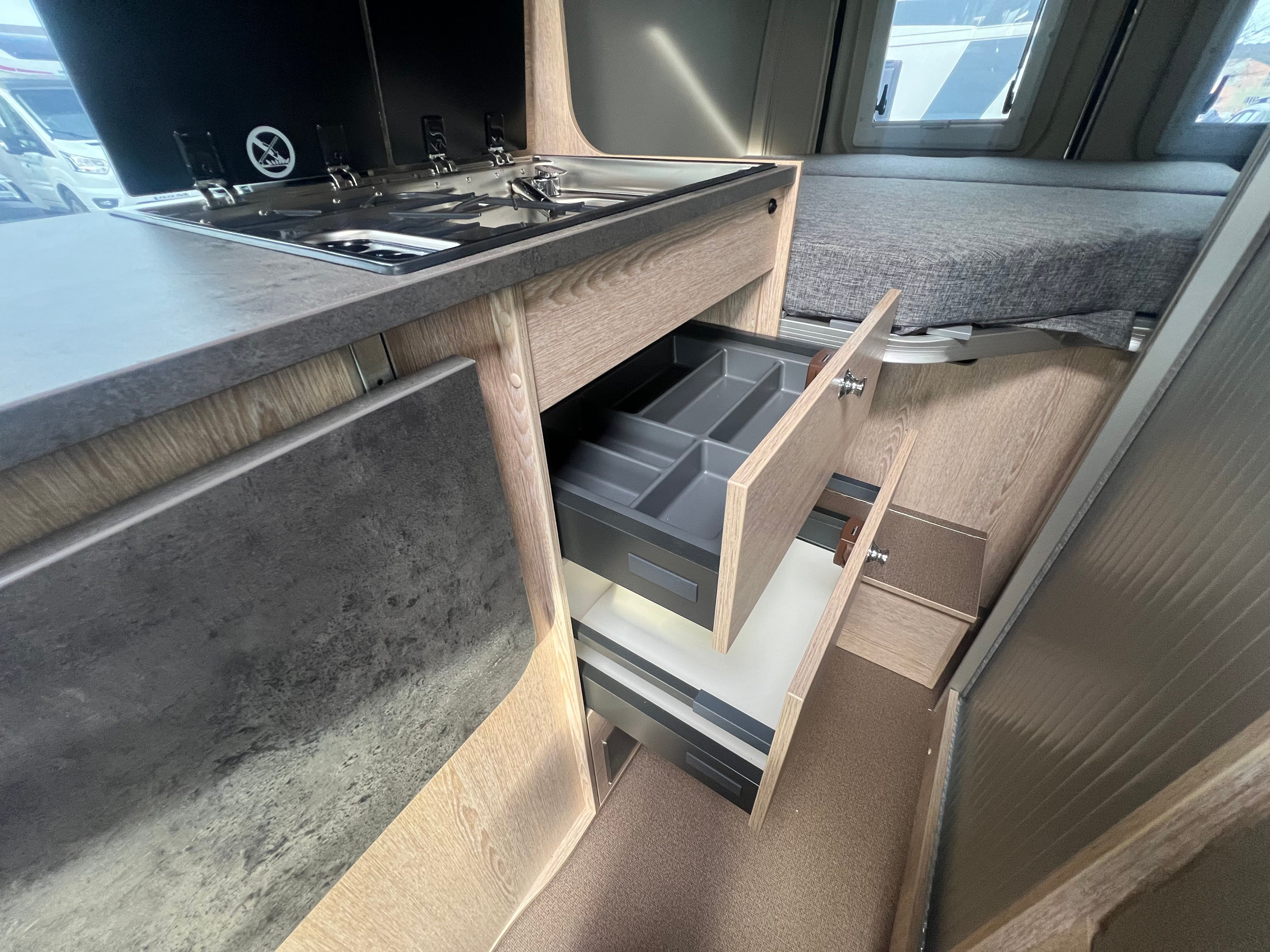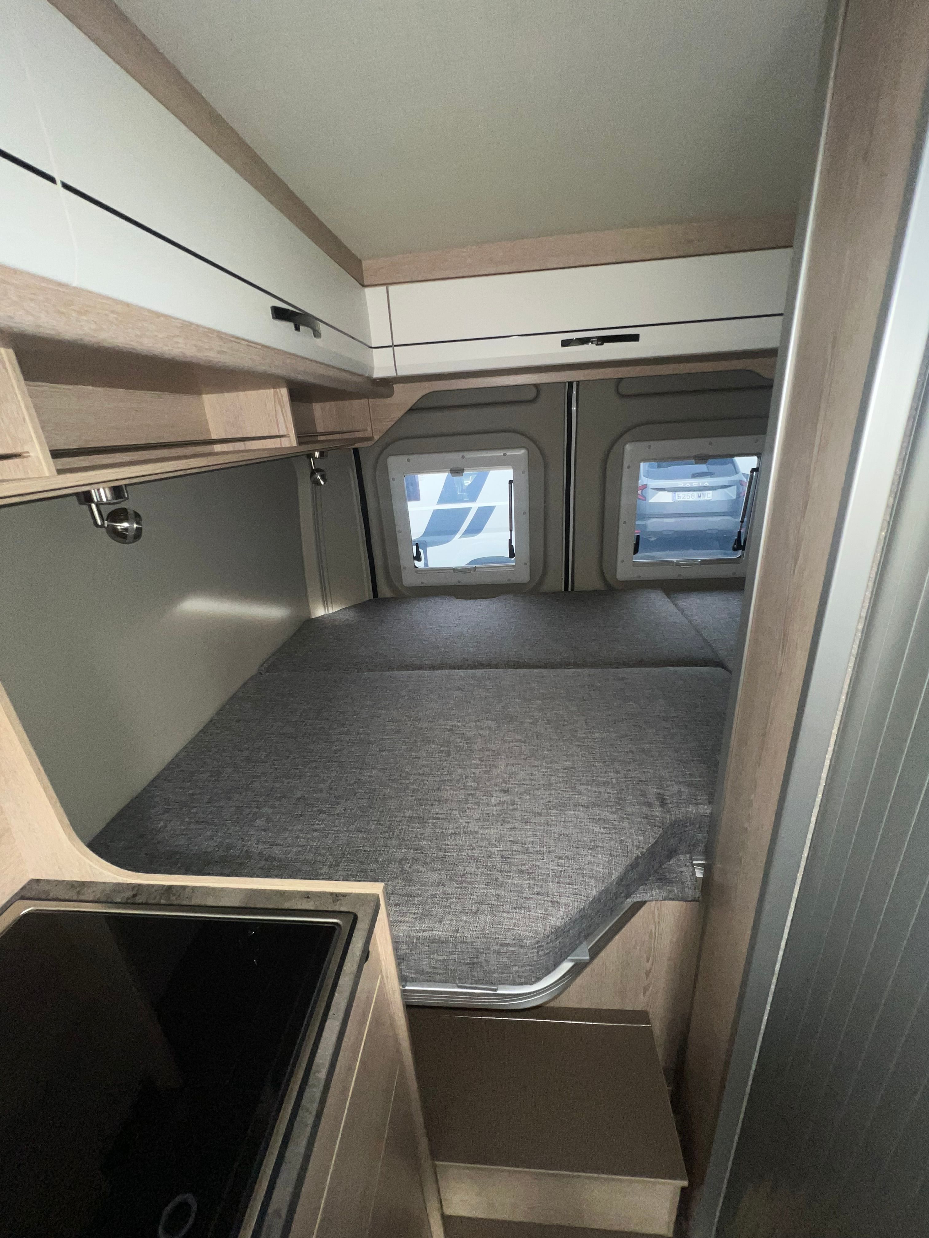 A l’interior incorpora seients davanters giratoris, cuina de 2 focs amb encès piezoelèctric i nevera de 100 L amb congelador, a més d’un bany complet amb dutxa i vàter giratori. Per gaudir-ne tot l’any, equipa calefacció i aigua calenta Truma Combi 4, dipòsit d’aigua neta 100 L i d’aigües grises 110 L, amb càrrega útil aprox. 820 kg i motor 2.2 turbodièsel Euro 6d (A/C i control de creuer segons versió).