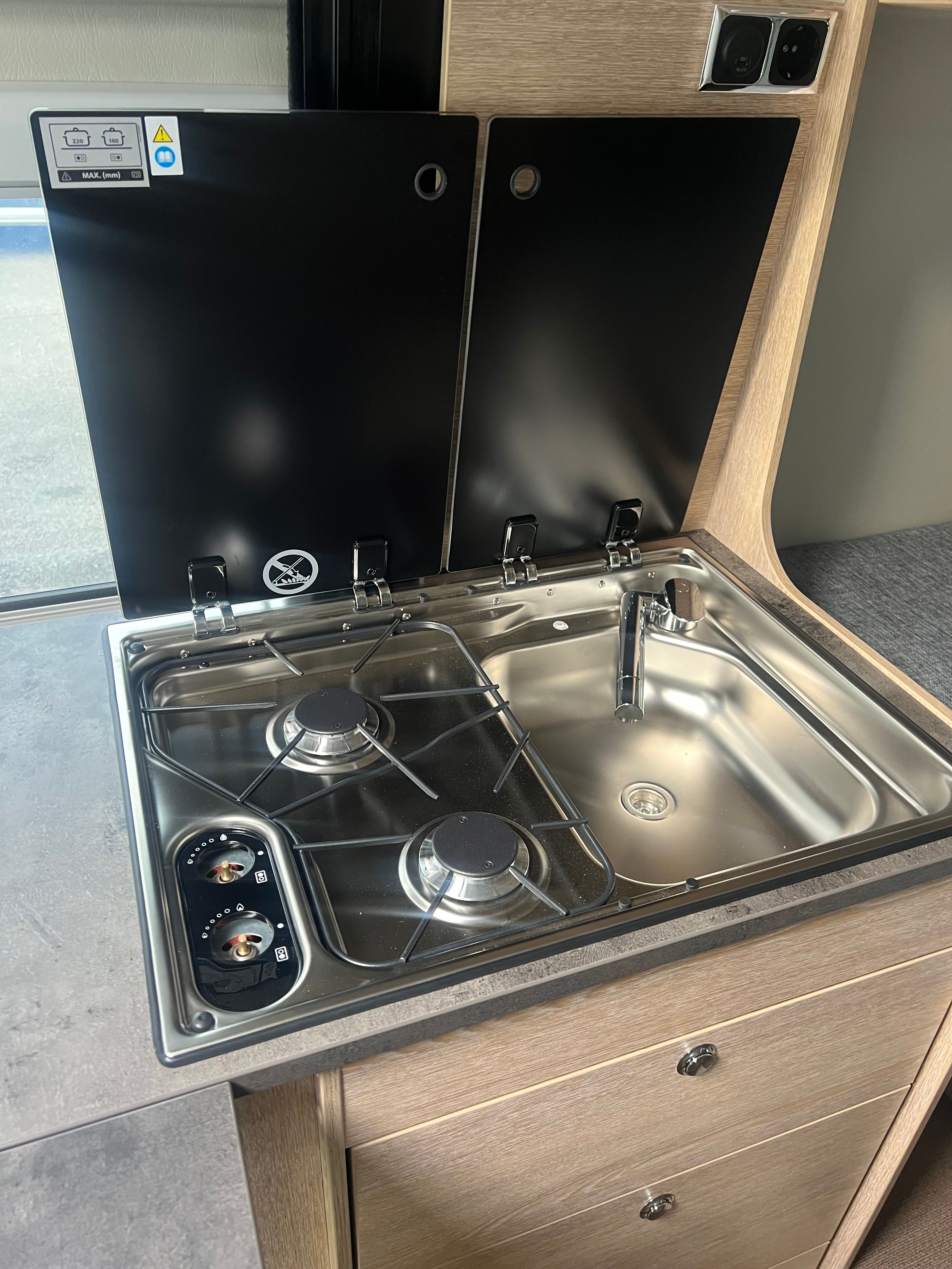 - Cuina de 2 focs amb encès piezoelèctric i tapa de vidre antiesquitxades