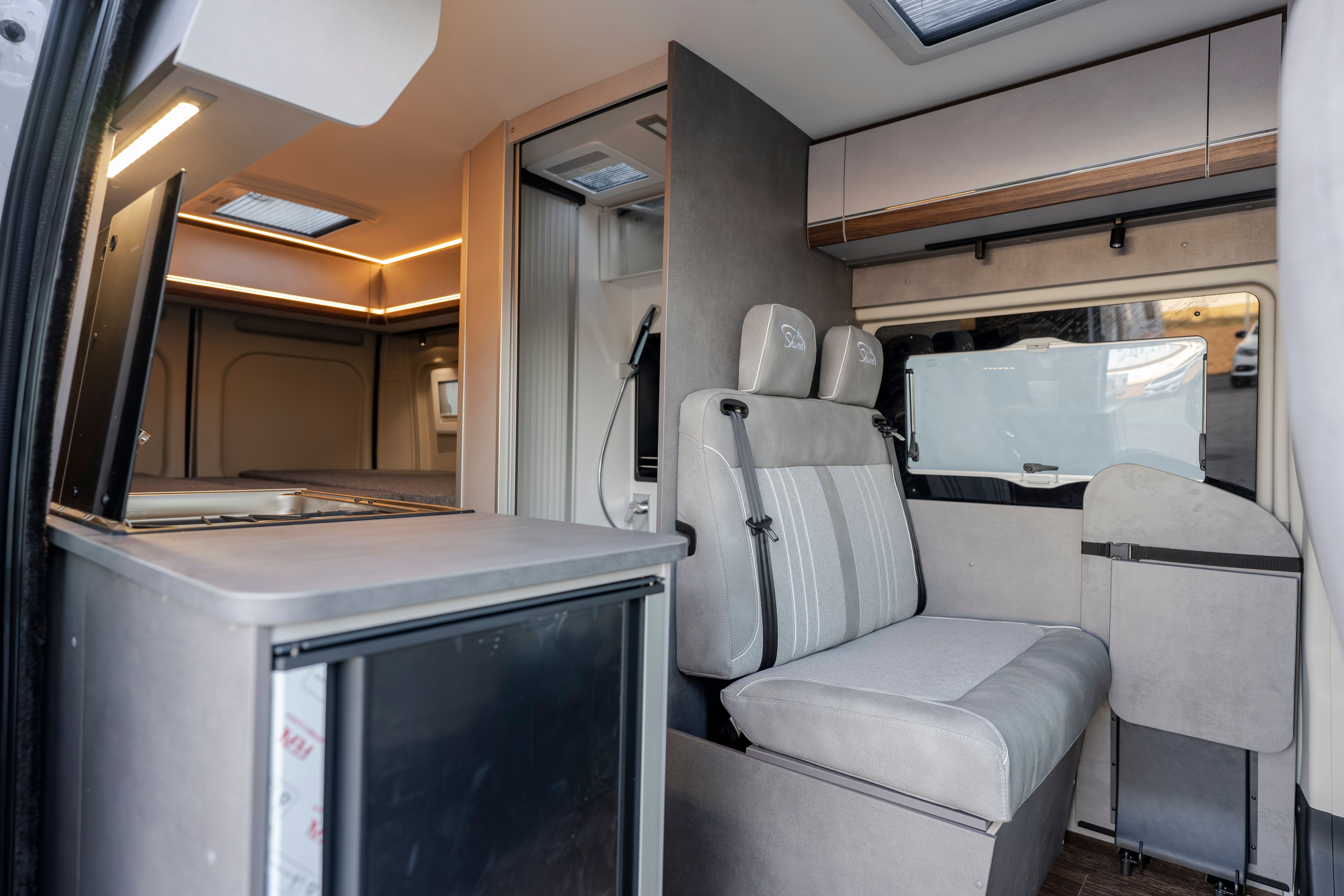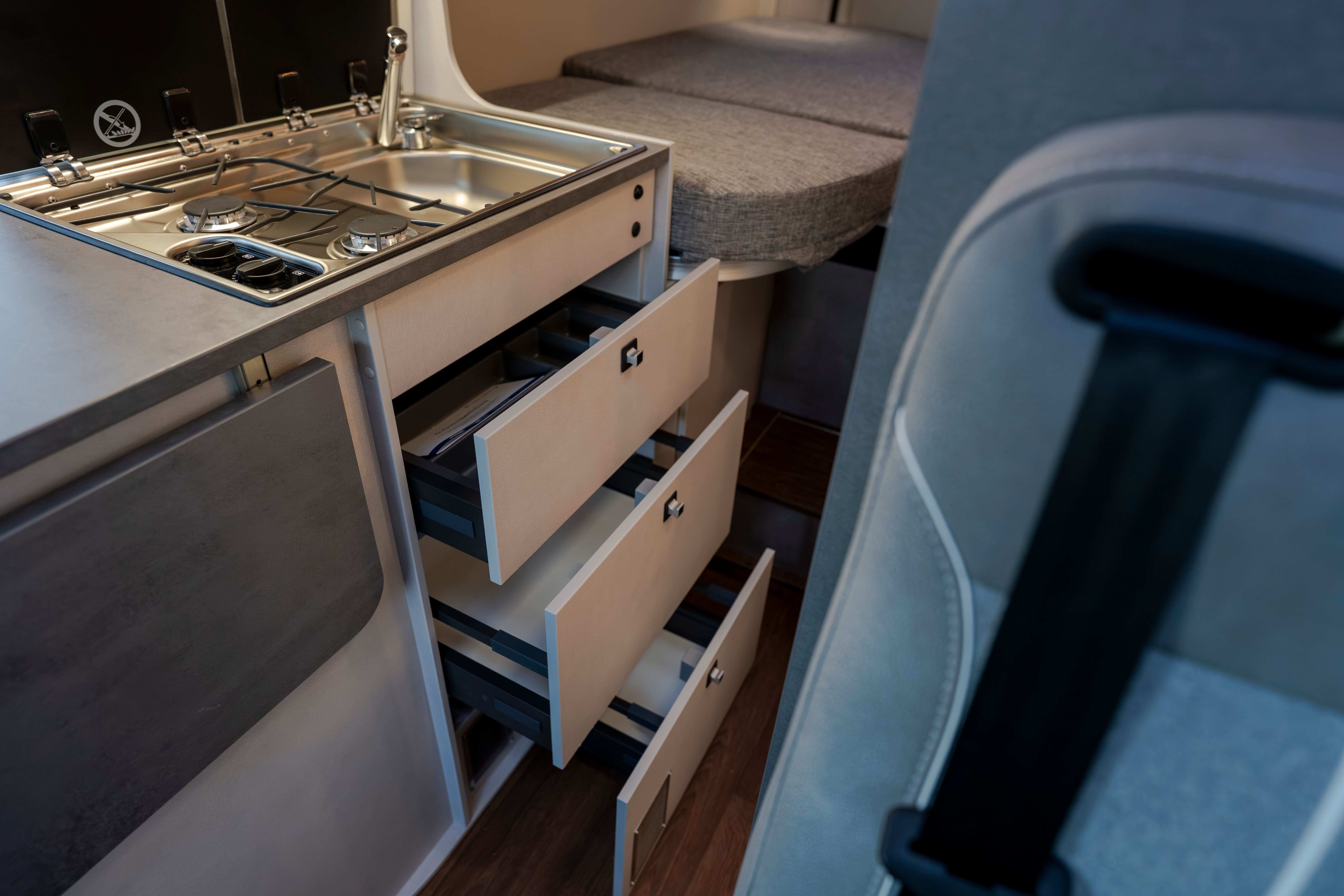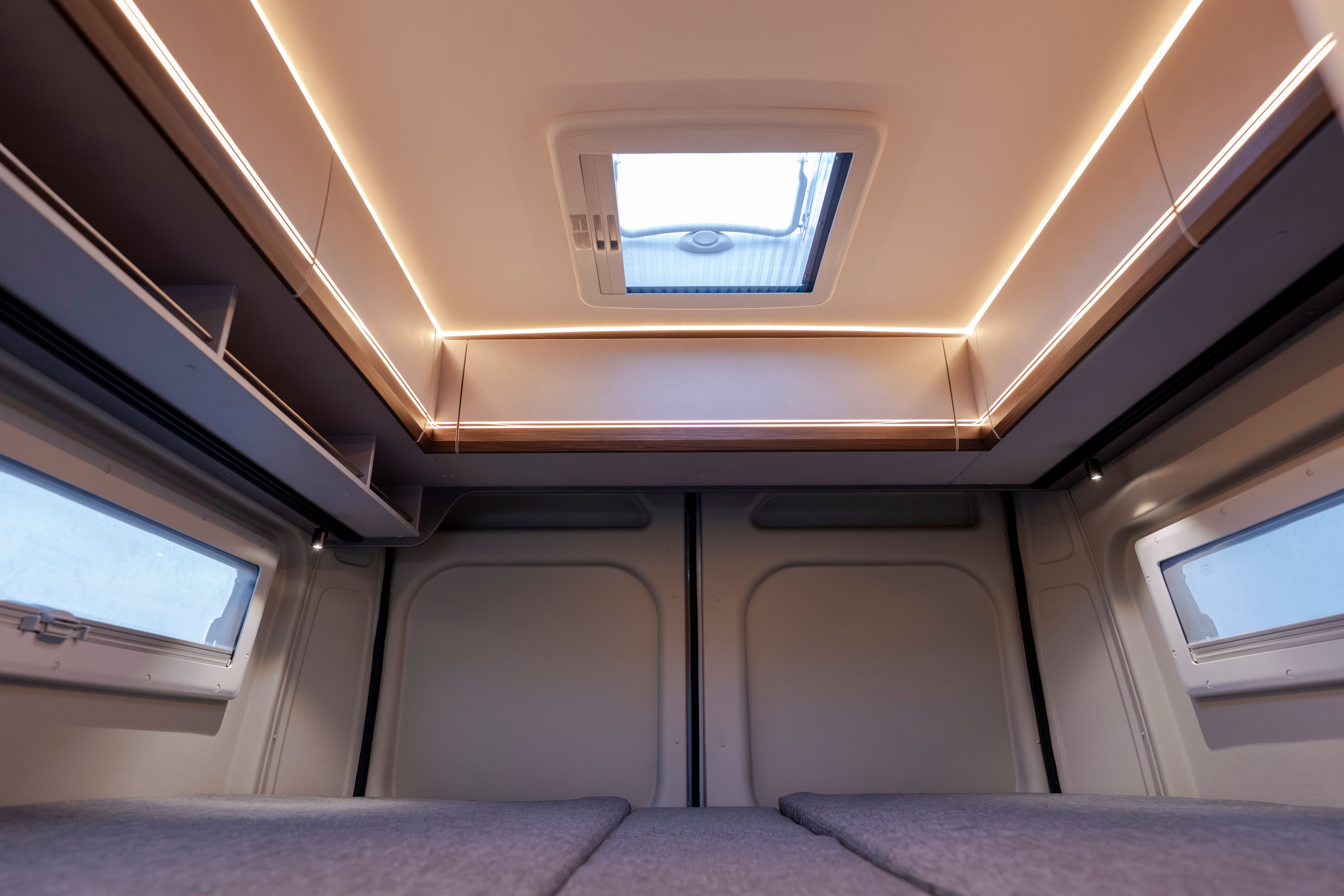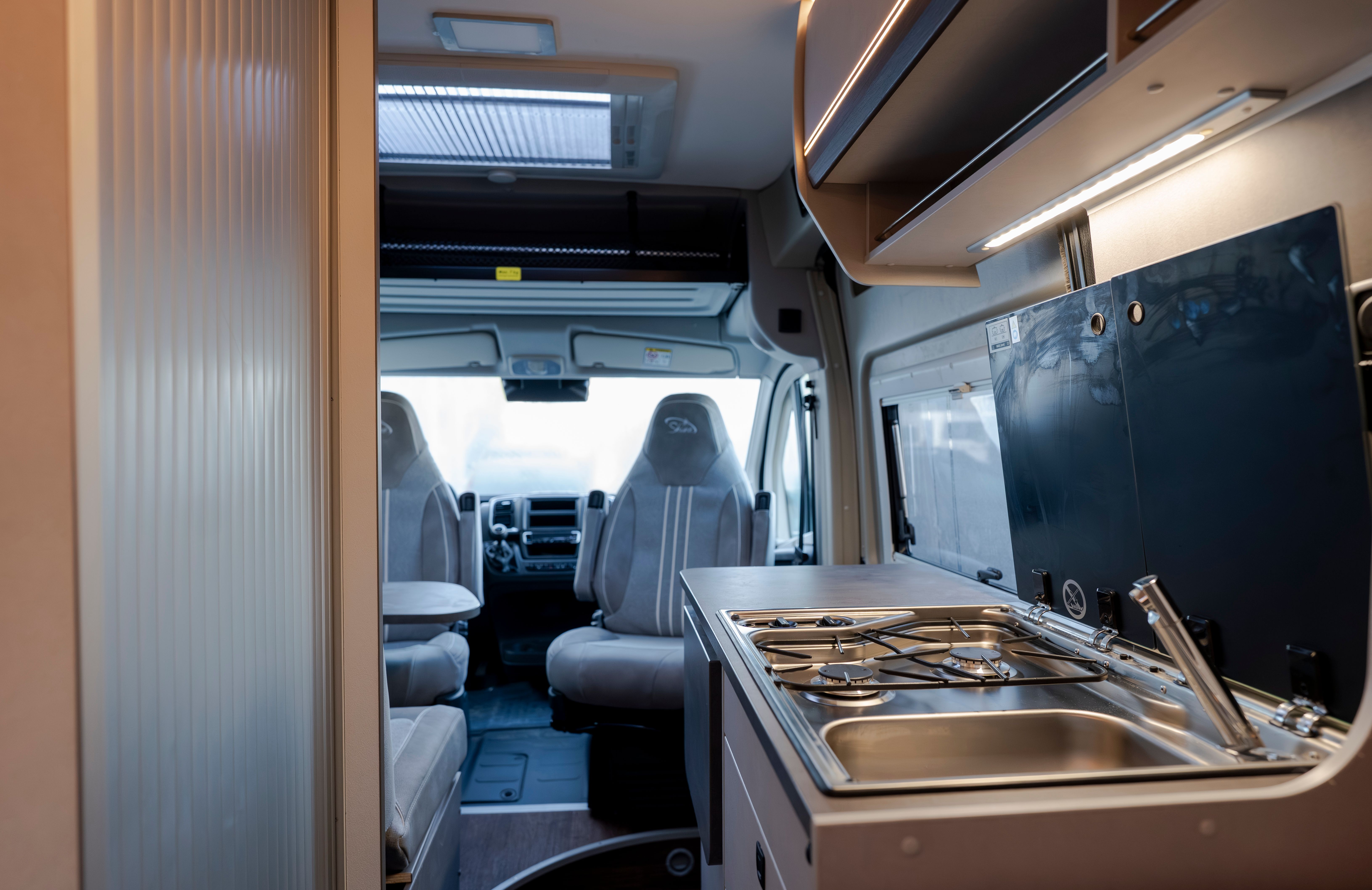 A l’interior, disposa d’un bany amb sistema giratori, una cuina equipada amb frigorífic de compressor de doble obertura i una àmplia llit longitudinal posterior. El sistema Truma Combi 4, juntament amb els dipòsits de gran capacitat, garanteix confort i autonomia durant tot l’any.